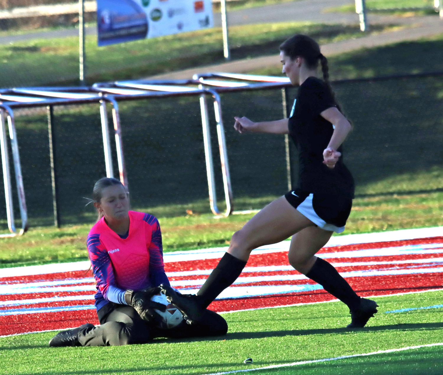 The two teams continued to trade chances as Troy’s Stella Rockwell had a long shot blocked by Hughesville keeper Kalia Hack, while at the other end Izzy came up big with another save in net.