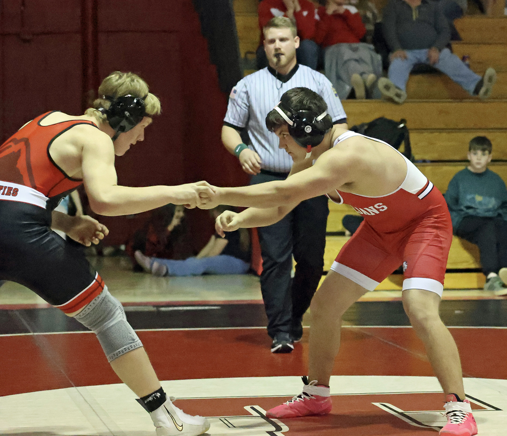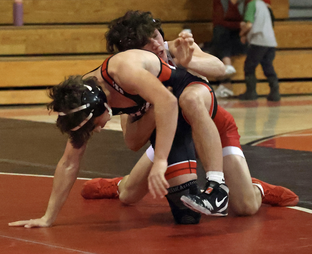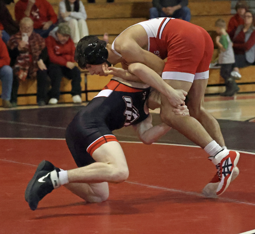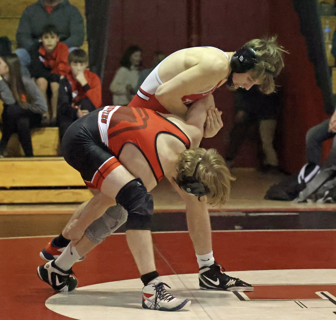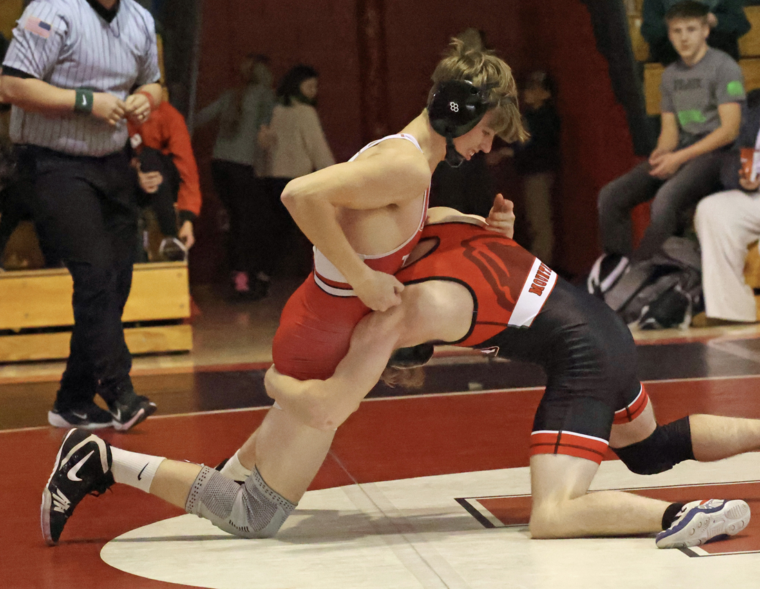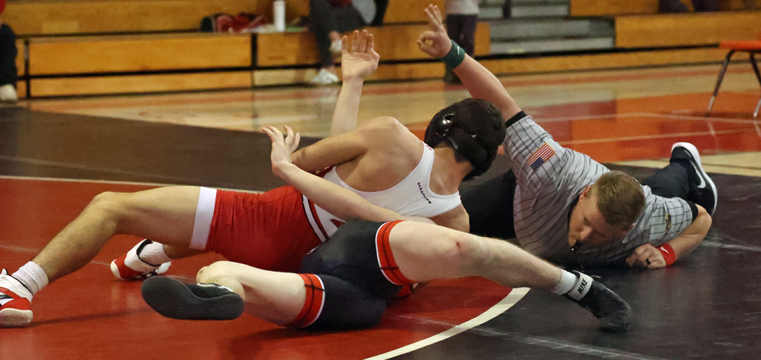 Troy followed with three straight first period falls as Frisbie pinned Hoyt Pequignot in 50 seconds, Kerr pinned Jonah Neill in 1:58, and Koch pinned Bentley Chilson in 57 seconds.