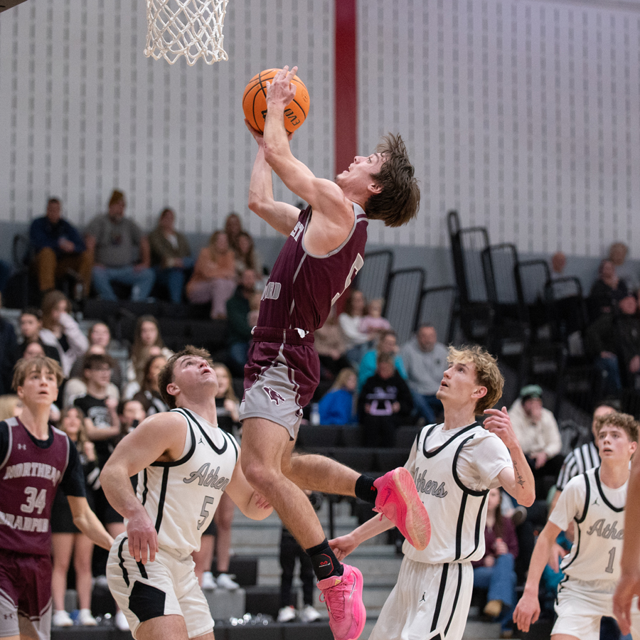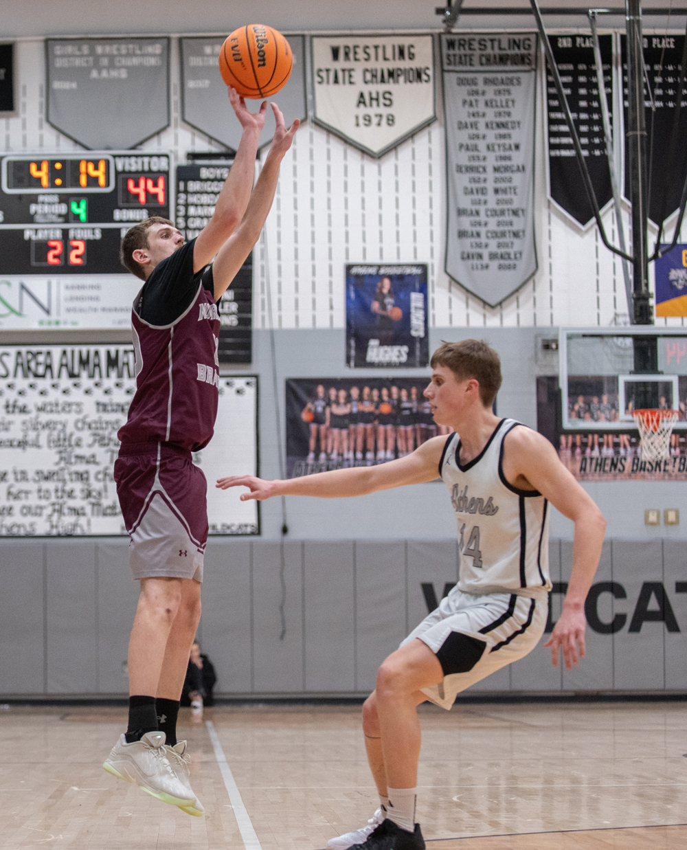 “This was a tough, gritty win on the road,” said NEB coach Paul Burgert. “Athens is a good defensive team and very scrappy. There was a good crowd there tonight, Friday night, a fun atmosphere. I'd say a playoff type atmosphere, which is great experience as we head down the stretch. And there’s something about that gym, we have struggled there so much. In my eleven years, tonight was the first time we have won in that gym.”