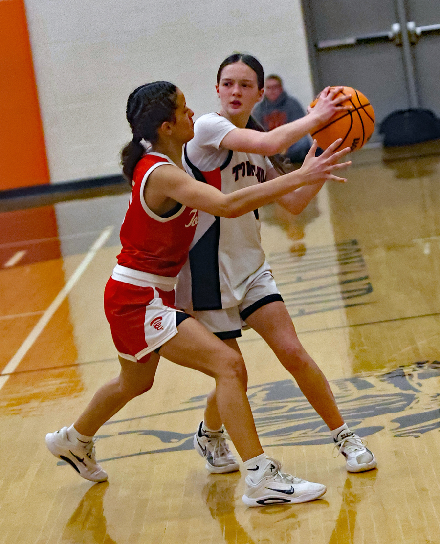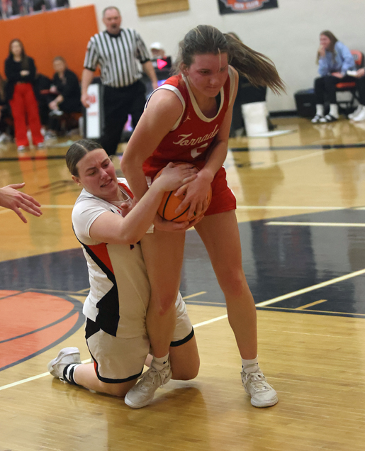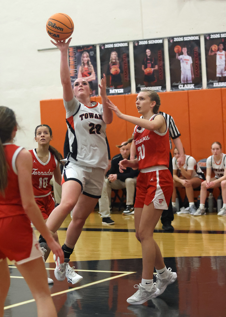 BY CHRIS MANNINGNorthern Tier Sports ReportTOWANDA — In a rematch of last year’s thrilling District IV, Class AAA third place game Towanda struggled with Mount Carmel’s length, and though they were able to rally in the second half they fell to the Red Tornadoes, 42-29, in the district quarterfinals.