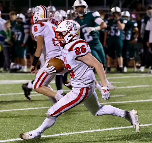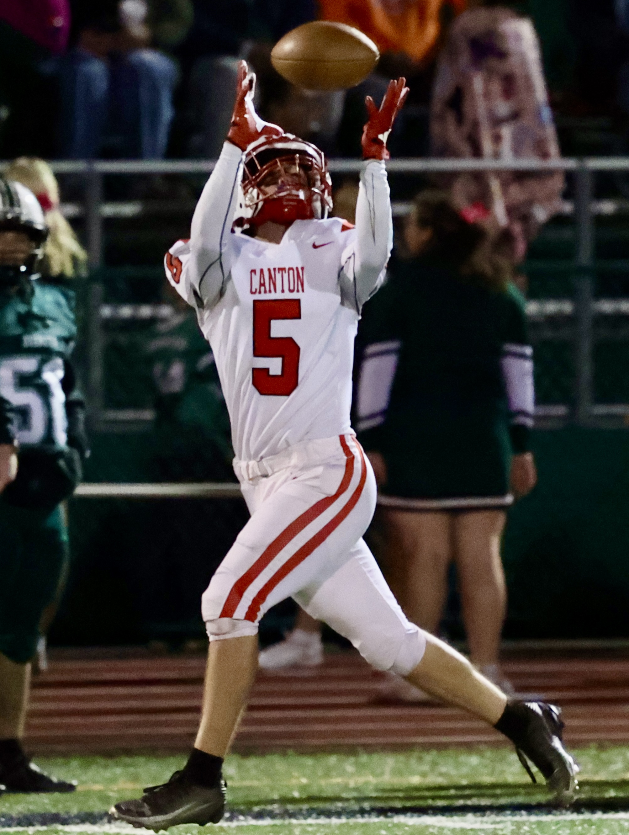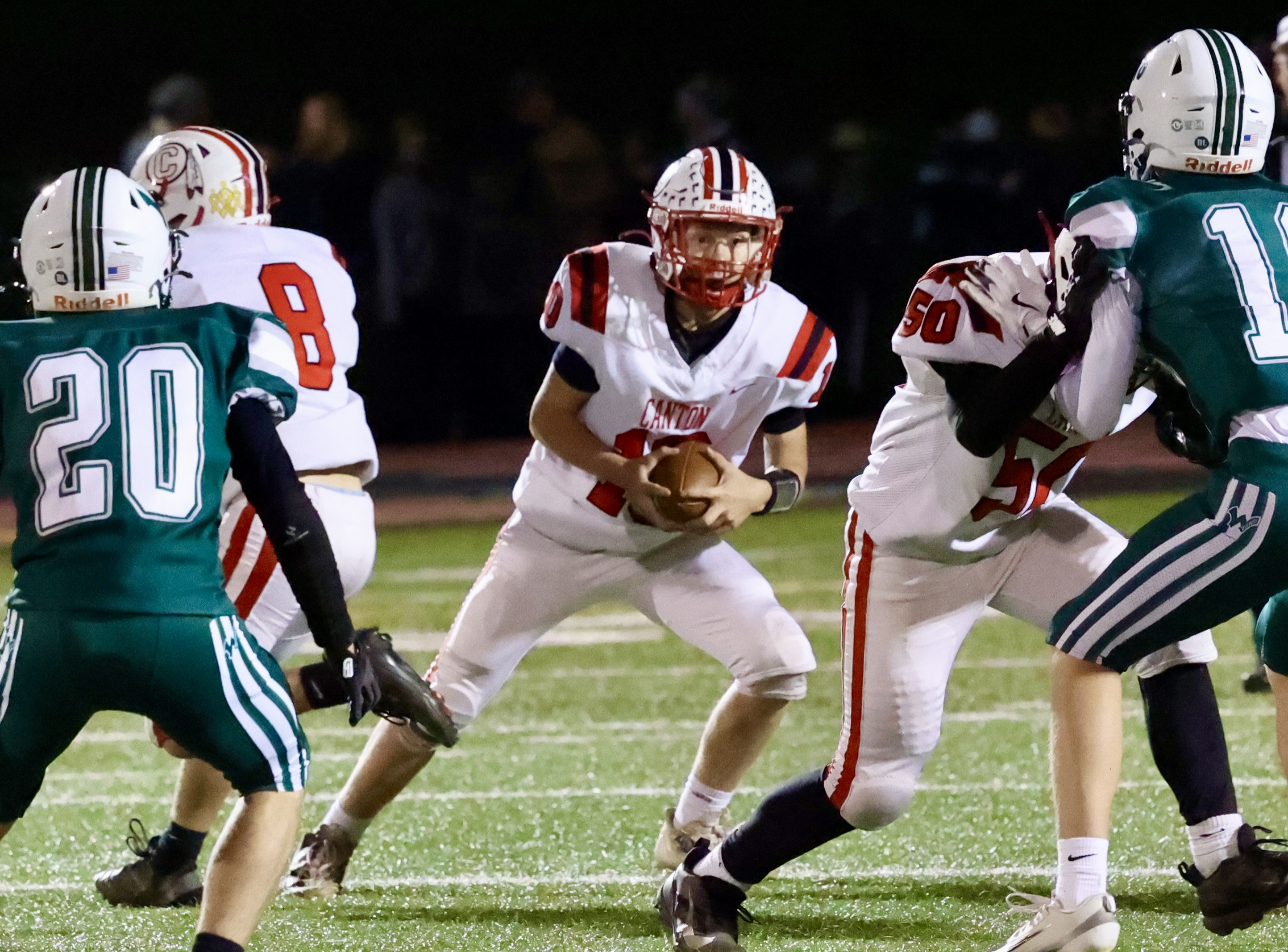 Owen Moore hit Rylan Wesneski for a 22-yard scoring strike with 5:00 left in the second got Canton on the scoreboard. Alexis McRoberts hit the point after.
