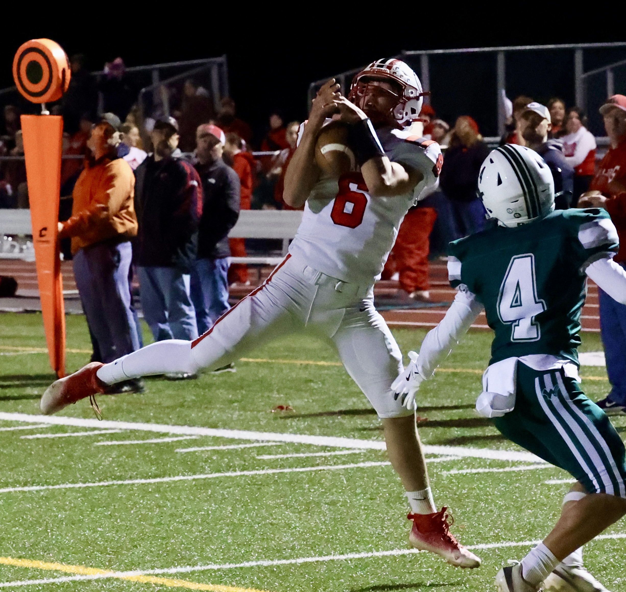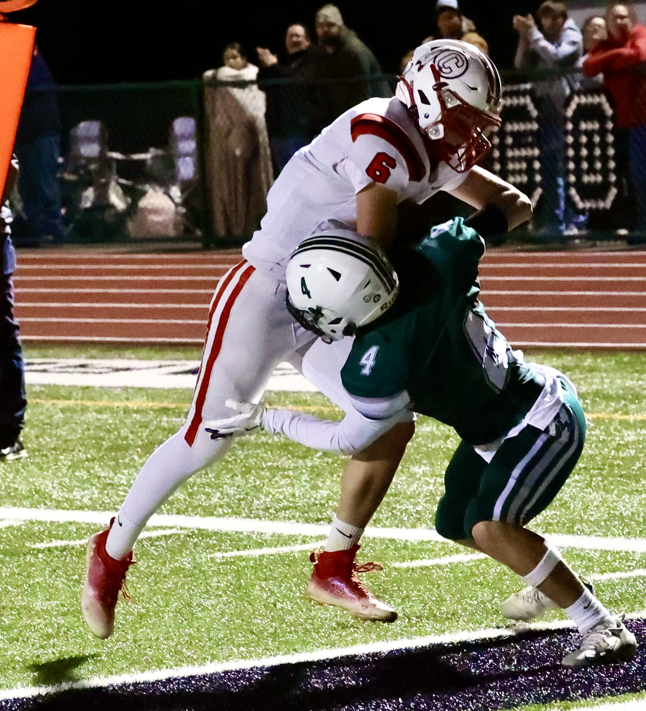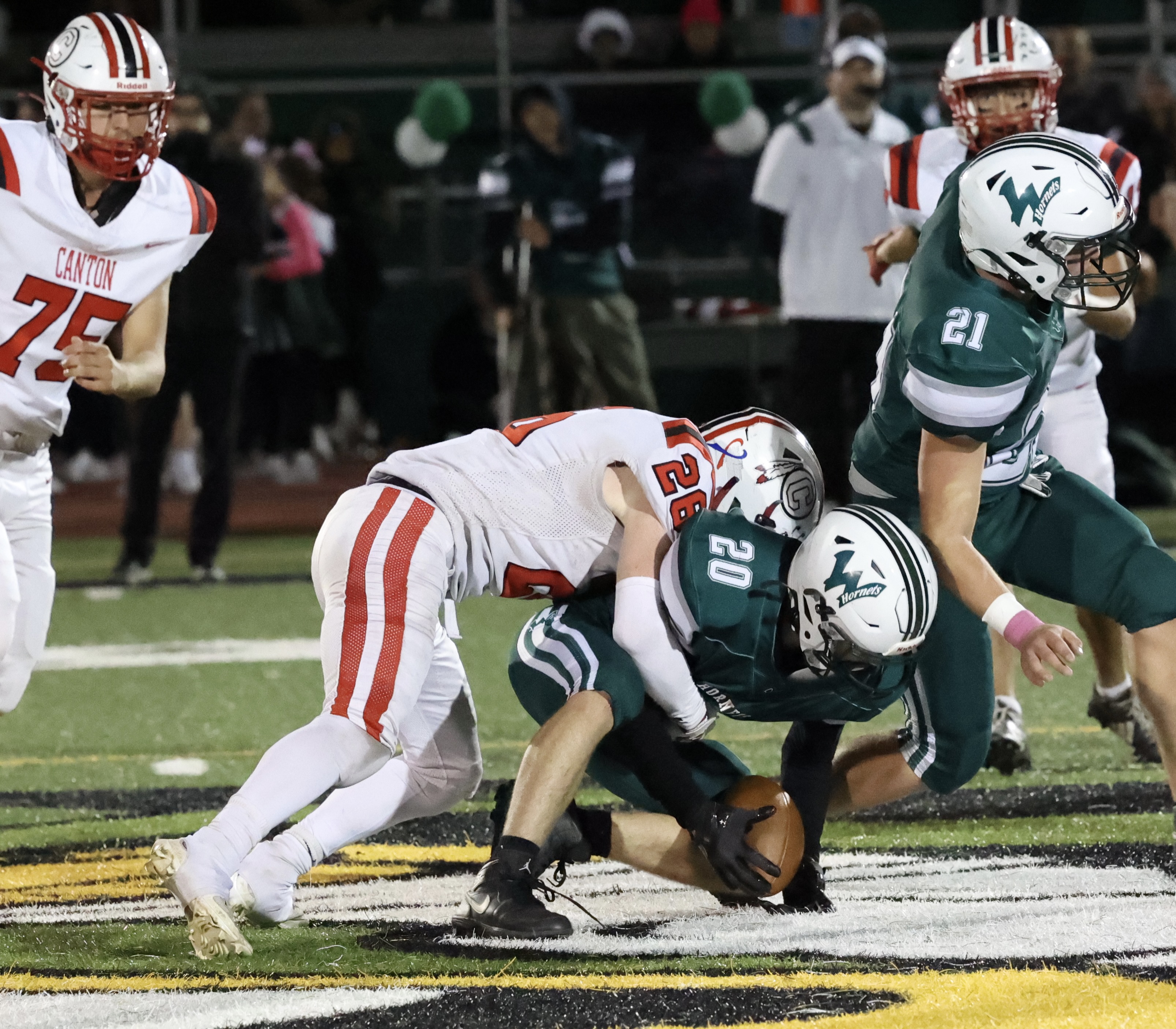 Owen Moore hit Rylan Wesneski for a 22-yard scoring strike with 5:00 left in the second got Canton on the scoreboard. Alexis McRoberts hit the point after.